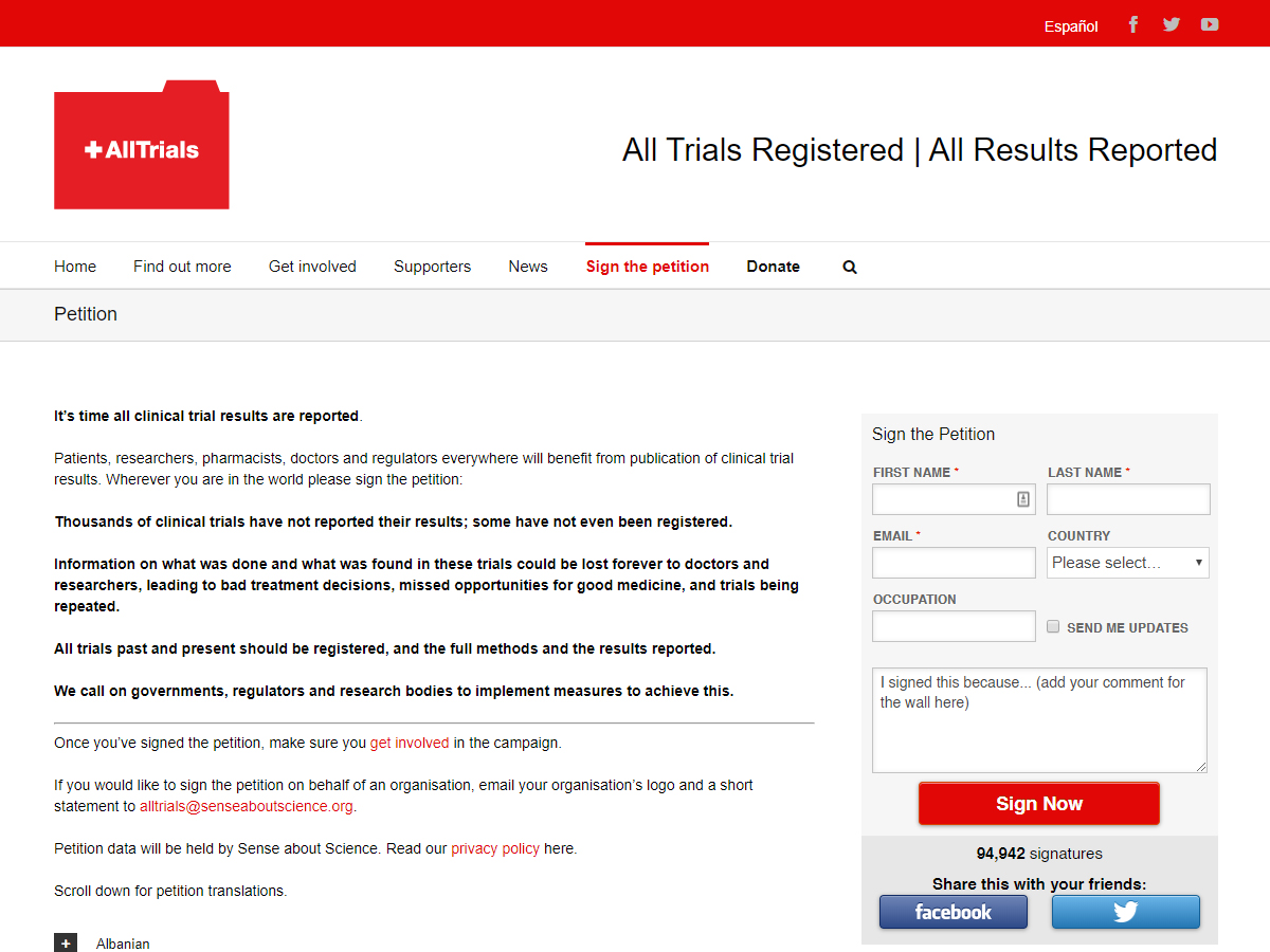The AllTrials campaign was launched in January 2013 and calls for all past and present clinical trials to be registered and their results reported. The campaign has published a detailed plan on how all clinical trials can be registered and all results reported.