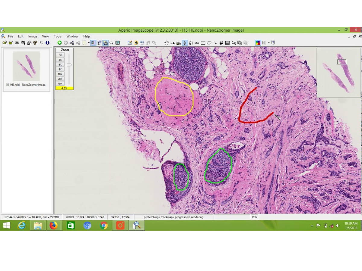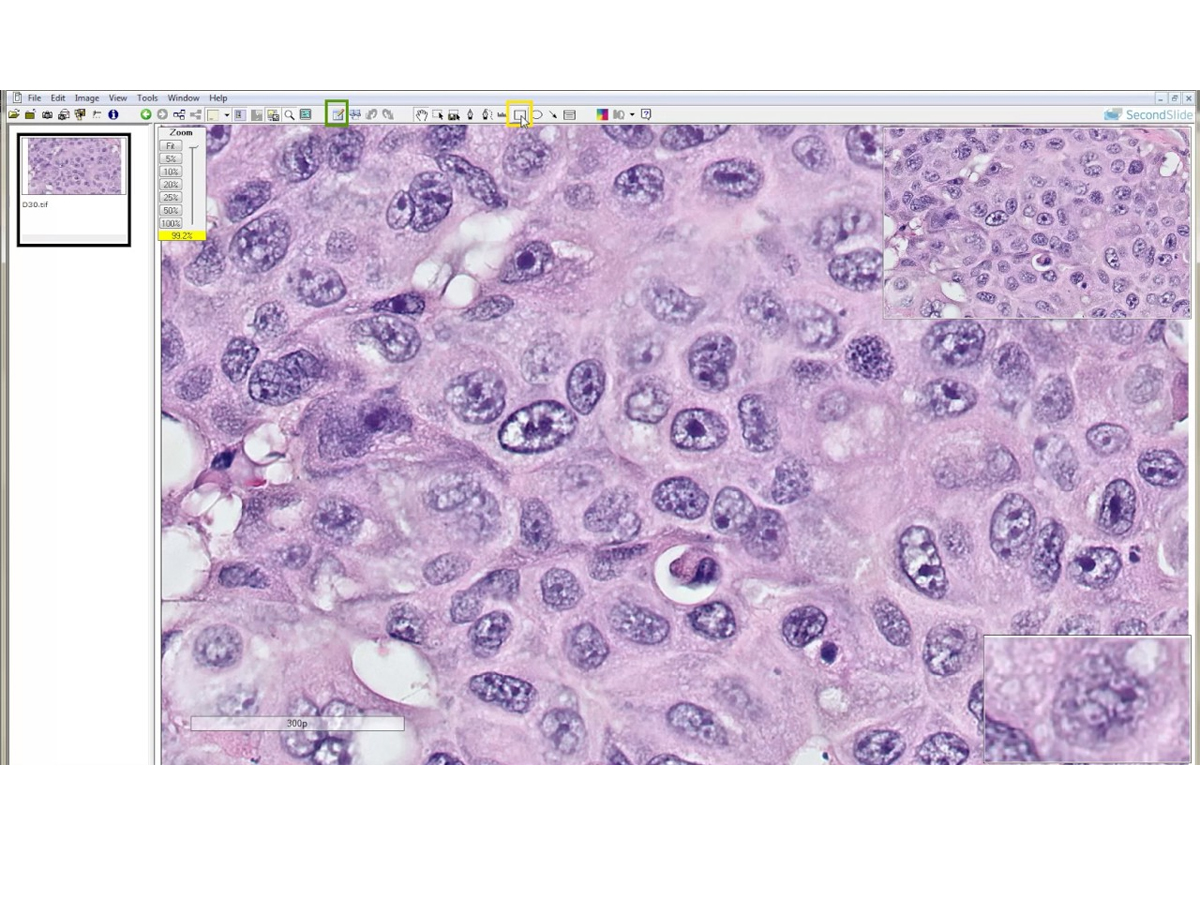 Viewing software for digital slide images where you can adjust magnification, pan and zoom, compare different stains, annotate areas of interest, and perform image analysis.
