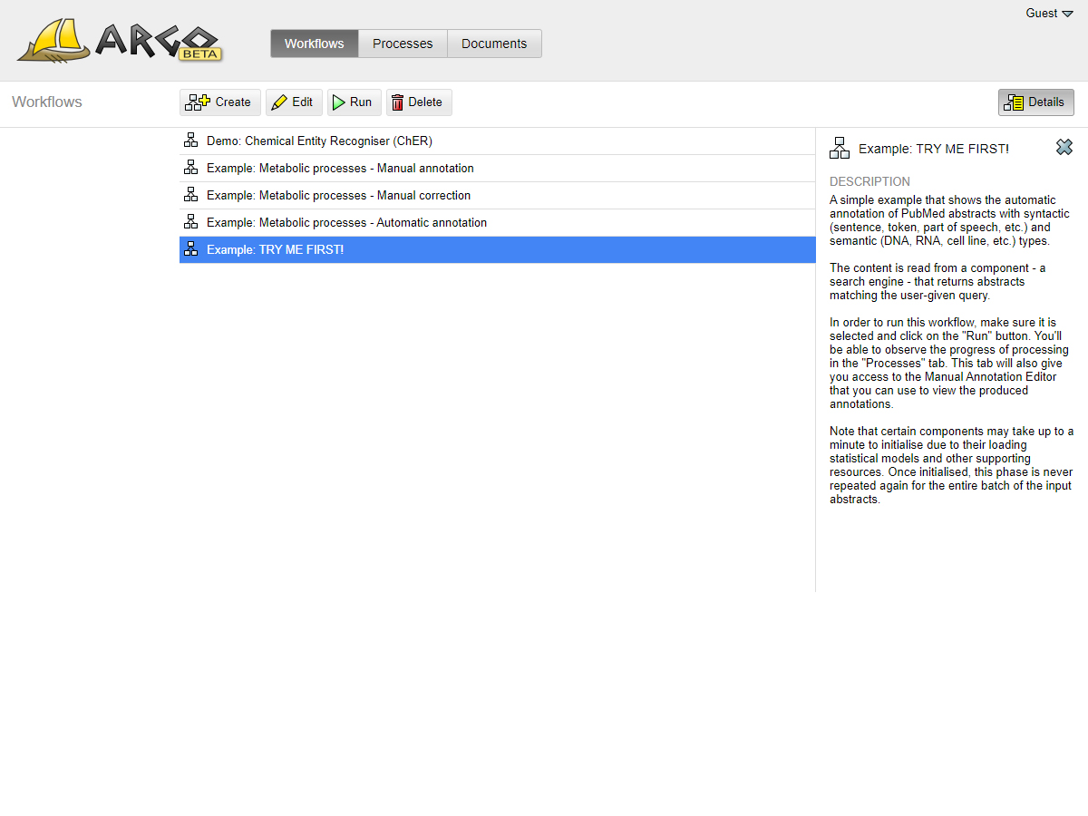 A workbench for building text-mining solutions with the use of a rich graphical user interface, for the process of biocuration. Central to Argo are customizable workflows that users compose by arranging available elementary analytics to form task-specific processing units. A built-in manual annotation editor is the single most used biocuration tool of the workbench, as it allows users to create annotations directly in text, as well as modify or delete annotations created by automatic processing components.