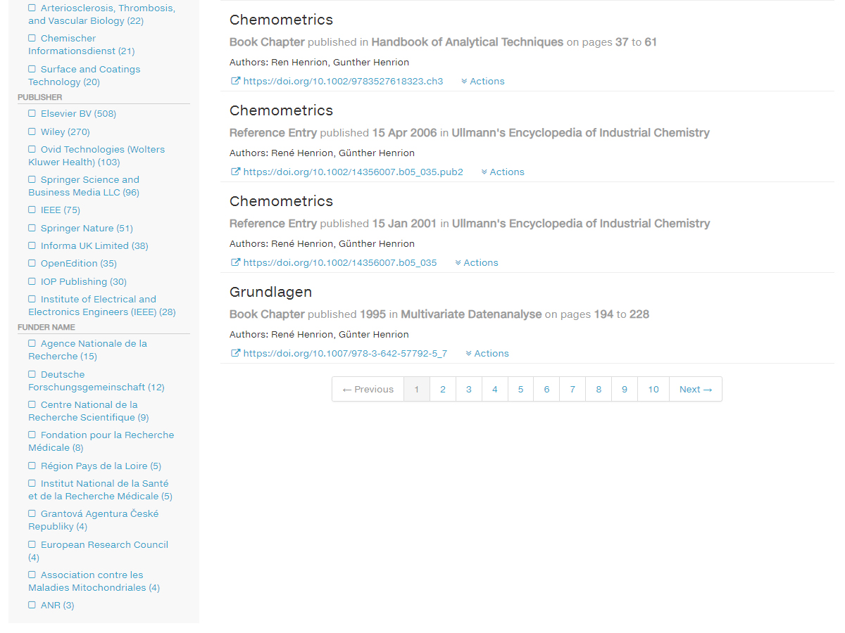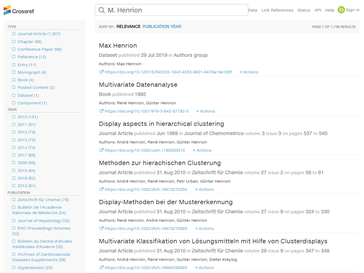 Crossref Metadata Search allows you to search across the almost 50 million Crossref Metadata records* for journal articles and conference proceedings. It supports the following features: ORCID Support Faceted searches Copying of search results as formatted citations using CSL COinS, so that you can easily import results into Zotero and other document management tools An API, so that you can integrate Crossref Metadata Search into your own applications, plugins, etc. Basic OpenSearch support- so that you can integrate Crossref Metadata Search into your browser’s search bar. Searching for a particular Crossref DOI Searching for a particular Crossref ShortDOI Searching for articles in a particular journal via the journal’s ISSN Links to any patents that cite a particular Crossref DOI