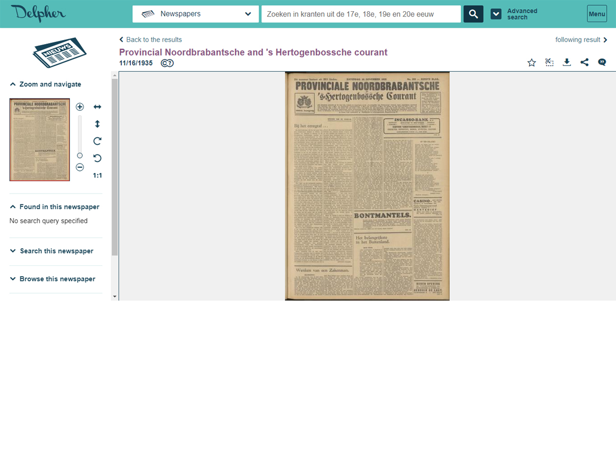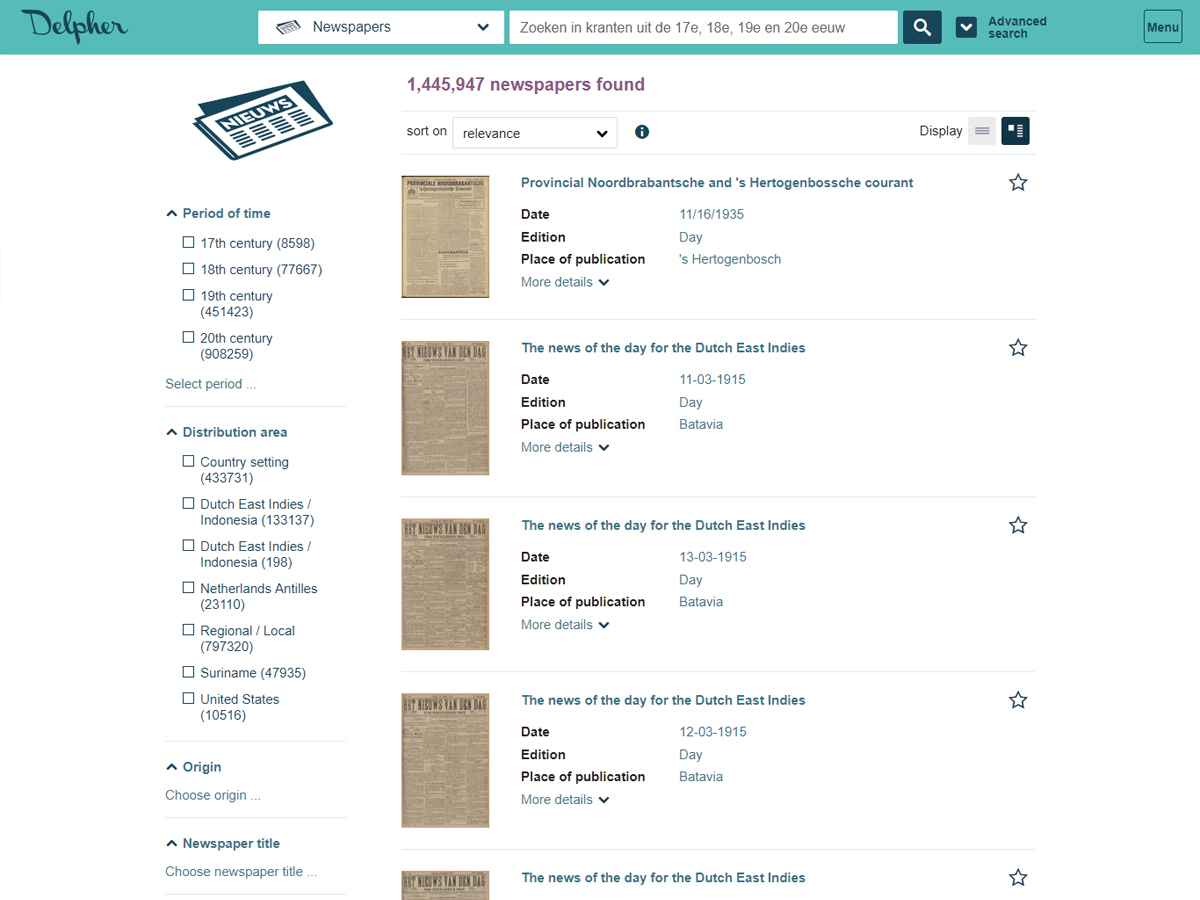 Delpher is a website that provides full-text Dutch-language digitized historical newspapers, books, journals, and copy sheets for radio news broadcasts. The material is provided by libraries, museums, and other heritage institutions. Delpher is freely available and includes about 1 million newspapers, 180,000 books, and 1.5 million journal pages. An extended guide on how to use the vast database can be found at historiek.net.