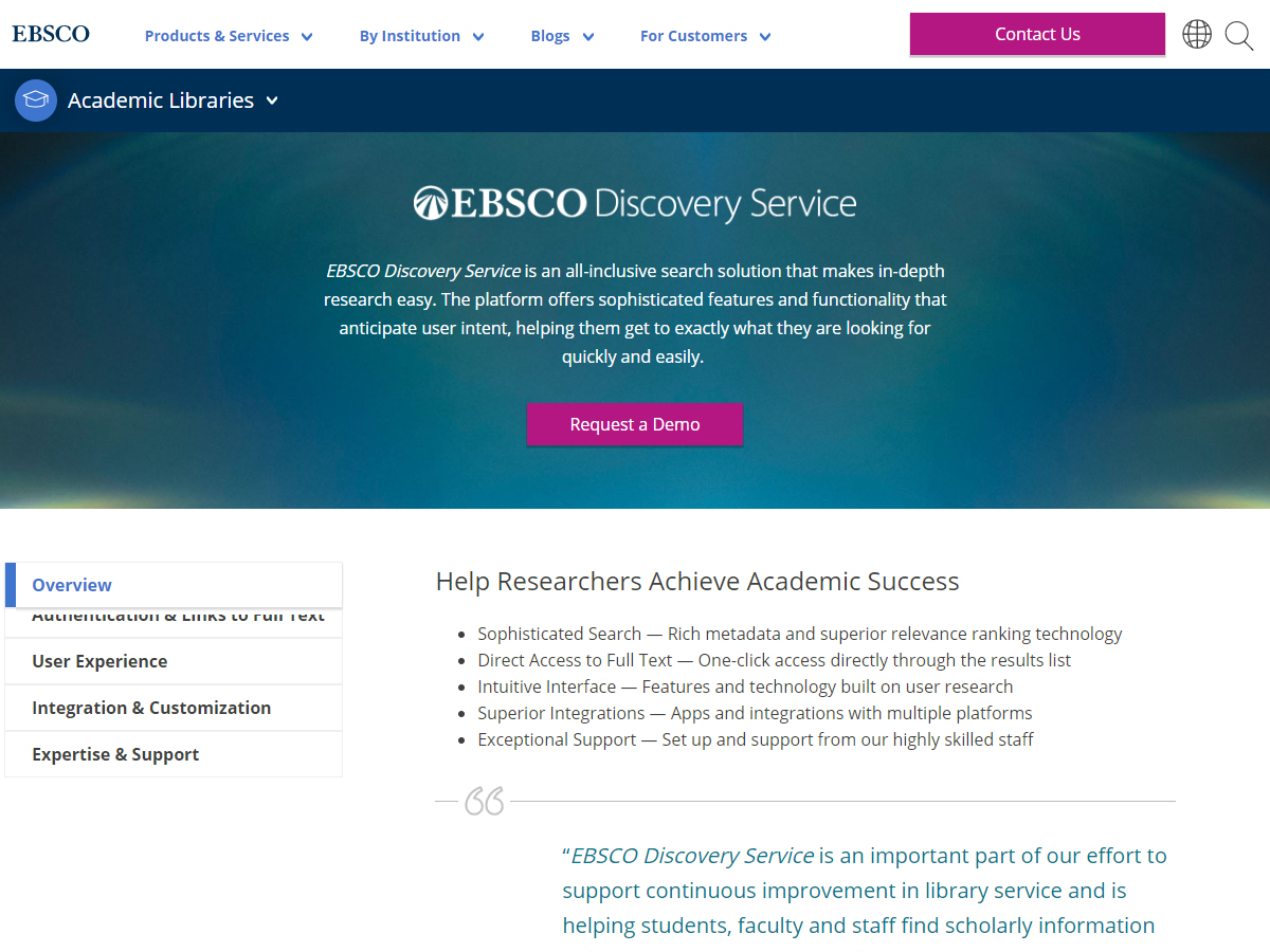 EBSCO Discovery Service (EDS) brings together the most comprehensive collection of content – including superior indexing from top subject indexes, high-end full text, and a library’s collection – all within an unparalleled, full-featured customizable discovery layer that is vendor-neutral and fully interoperable with other important library services. EDS supports integrated searching of content from full-text databases, citation databases, and local content collections such as library catalogs and other locally managed digital collections. The integrated search experience is achieved by compiling and indexing metadata from a variety of content sources into a unified pre-indexed search platform.