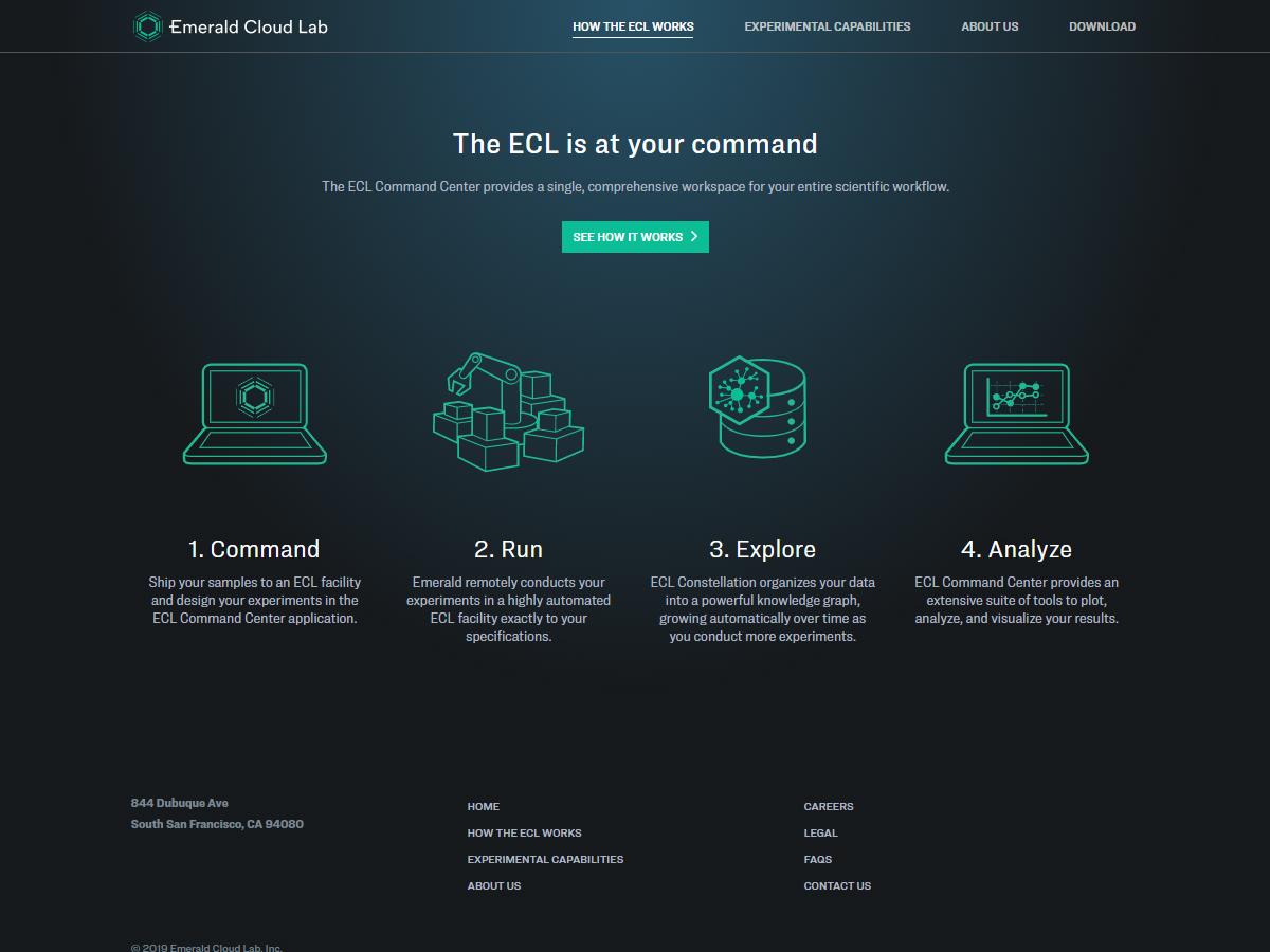The (ECL) Emerald Cloud Lab is a web-based life sciences lab. It empowers scientists to specify experiments with the precision and reproducibility of code, and to abstract away the physical execution of those experiments to Emerald’s robotically-driven facility in South San Francisco, founded in 2010. The resulting experimental data is accessible in perpetuity, detailed metadata is linked and explorable, and investigators are equipped with a suite of computational tools to drive of the algorithmic components of data analysis, freeing them to focus on the insights that are uniquely derived by scientists.
