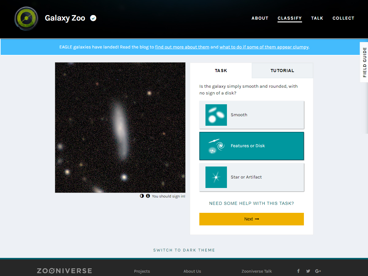 Galaxy Zoo is an online crowdsourced astronomy citizen science project in which public volunteers classify galaxies in an effort to benefit cutting-edge astronomy research.