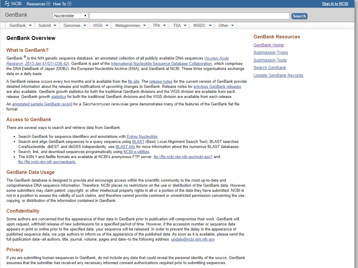 GenBank is an annotated collection of all publicly available DNA sequences. It is a part of the International Nucleotide Sequence Database Collaboration, which comprises the DNA DataBank of Japan, the European Nucleotide Archive, and the GenBank at NCBI. The GenBank and European Nucleotide Archive repositories contain annotated collections of publicly available DNA sequences. GenBank is divided into three divisions; the main collection is CoreNucleotide; dbEST, which is a collection of short single-read transcript sequences from GenBank; and dbGSS (Genome Survey Sequences), which is a collection of unannotated short single-read primarily genomic sequences from GenBank, including random survey sequences, clone-end sequences, and exon-trapped sequences.