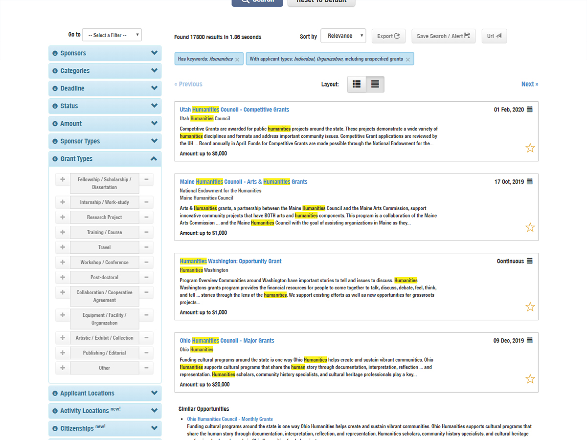 GrantForward is a search engine dedicated to helping institutions and individuals find grants to fund their research. Using data harvesting technology, GrantForward is able to cover more than 9,000 sponsor sources to provide a large and diverse database of funding opportunities that continues to grow with the most up to date information. Our powerful search system helps to lessen the hassle of searching for grants with adaptable search filters and specialized search features. GrantForward Researcher Profiles allow researchers to highlight their research achievements and interests to collaborate with other researchers and receive grant recommendations for grant opportunities that match their research needs.