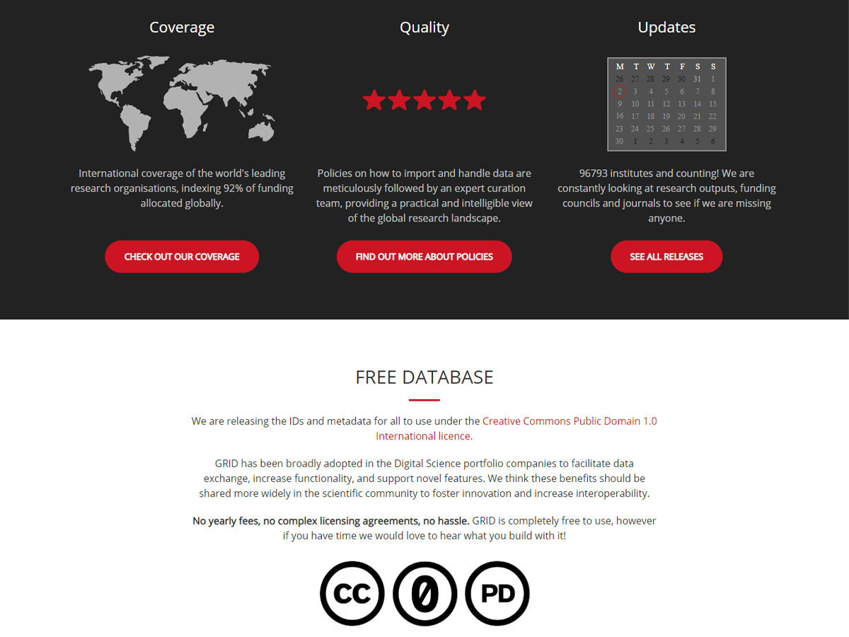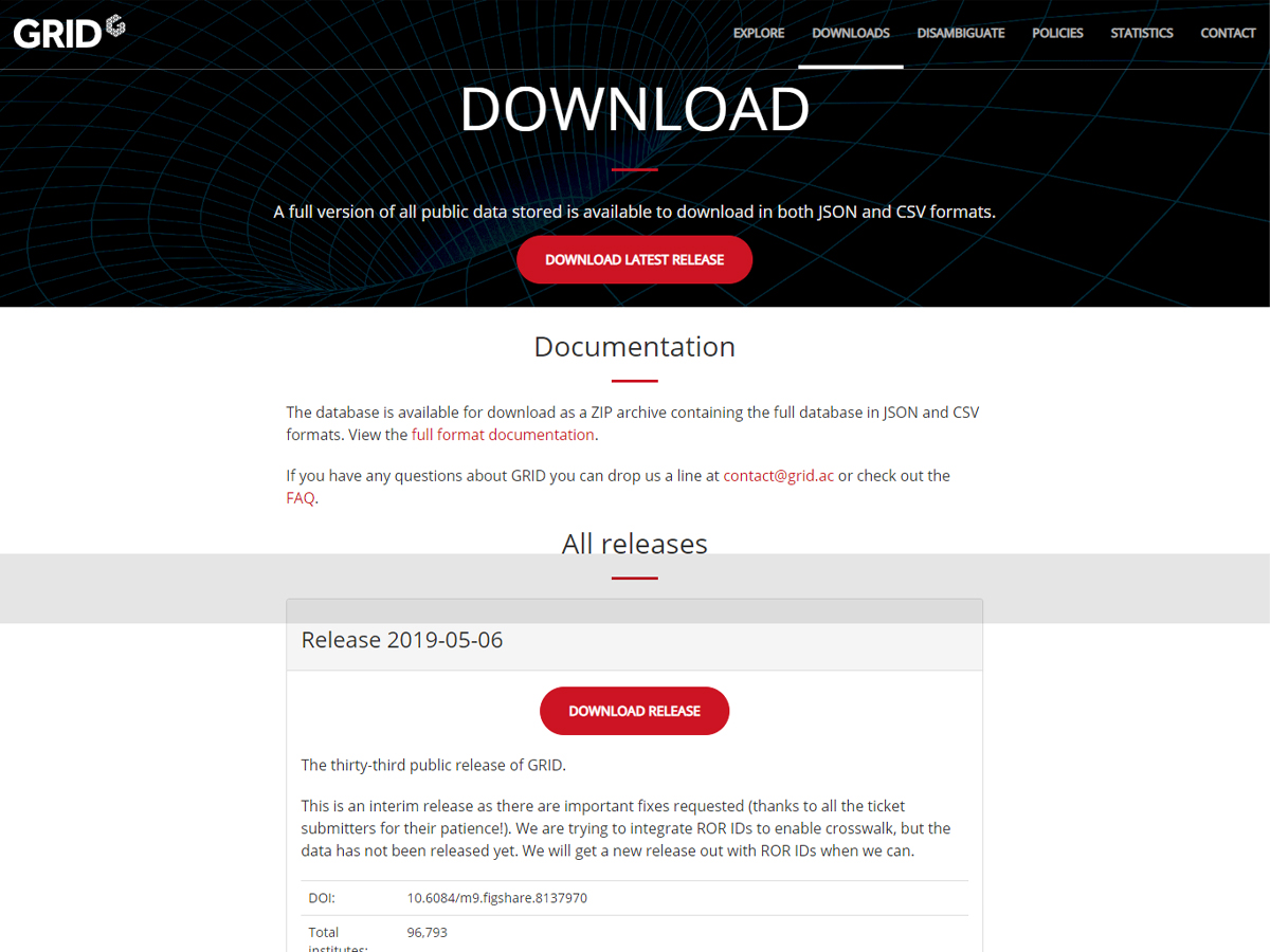 Global Research Identifier Database (GRID) is a free, easy-to-use online database that opens up information about research organisations around the world to data scientists, developers and innovators within academic and commercial organisations. The GRID dataset addresses the problem of messy and inconsistent data on research institutions, ensuring that each entity is included correctly and only once. It is created and maintained by Digital Science & Research Solutions Ltd., part of the technology company Digital Science.