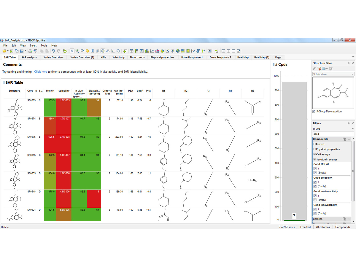 Lead Discovery is a Spotfire add-in that transforms TIBCO Spotfire into the premier platform for powerful chemical analytics. Import, sift through, and interpret chemical structures alongside other relevant data in a highly visual and interactive environment. Lead Discovery is a powerful way to explore complex chemical data so that key relationships can be better understood and decisions can be made with increased confidence.