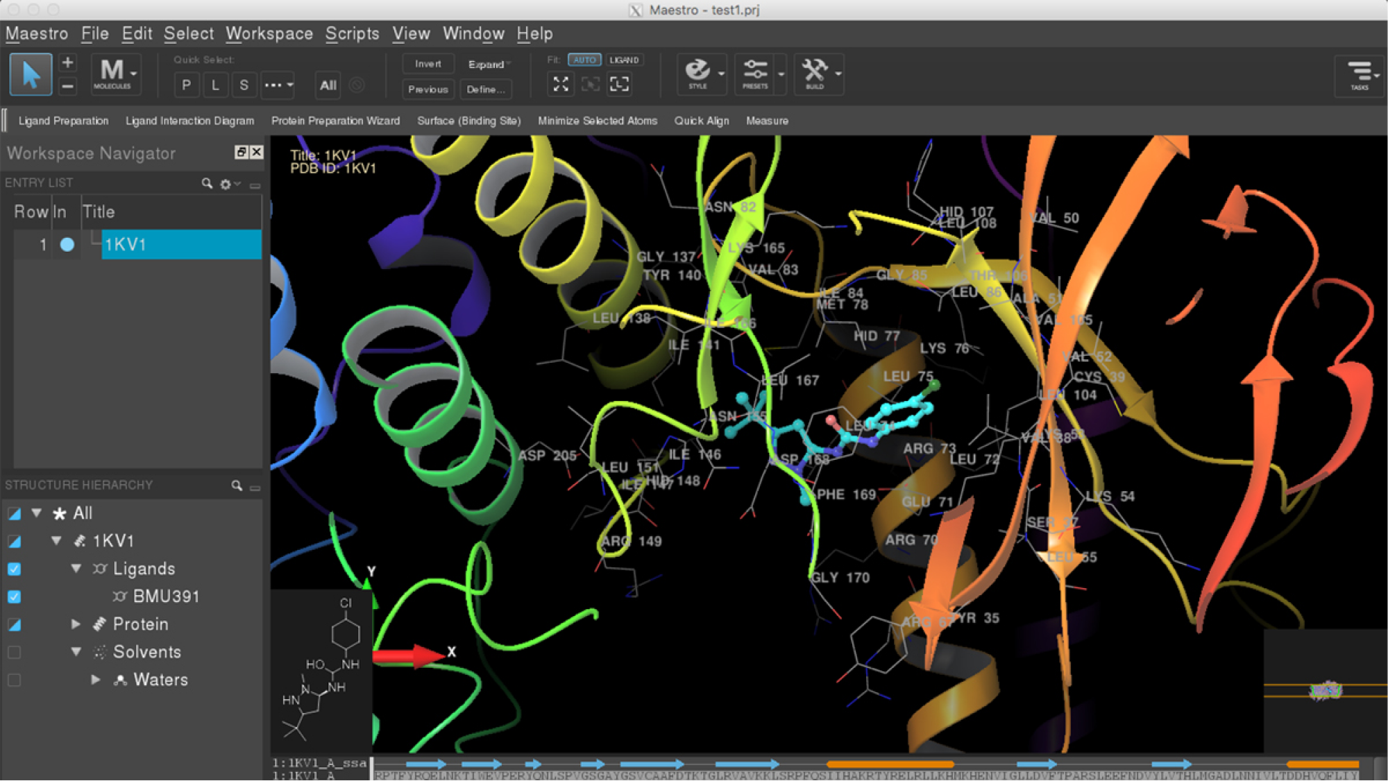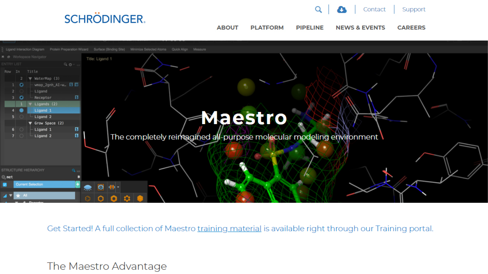 Maestro is Schrödinger’s GUI to various computational modelling tools. It can be used for the visualization of a broad spectrum of molecular structures, ranging from small molecules to large biomolecules. Moreover, the GUI can be used to initialize several computational tasks like docking, molecular dynamics, energy minimization and virtual screening. Furthermore, the tool supports tailor-made scripts for task automation.