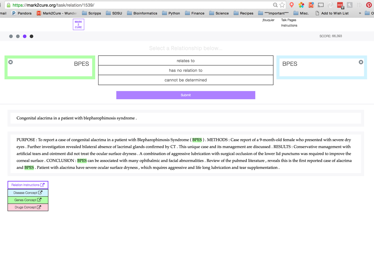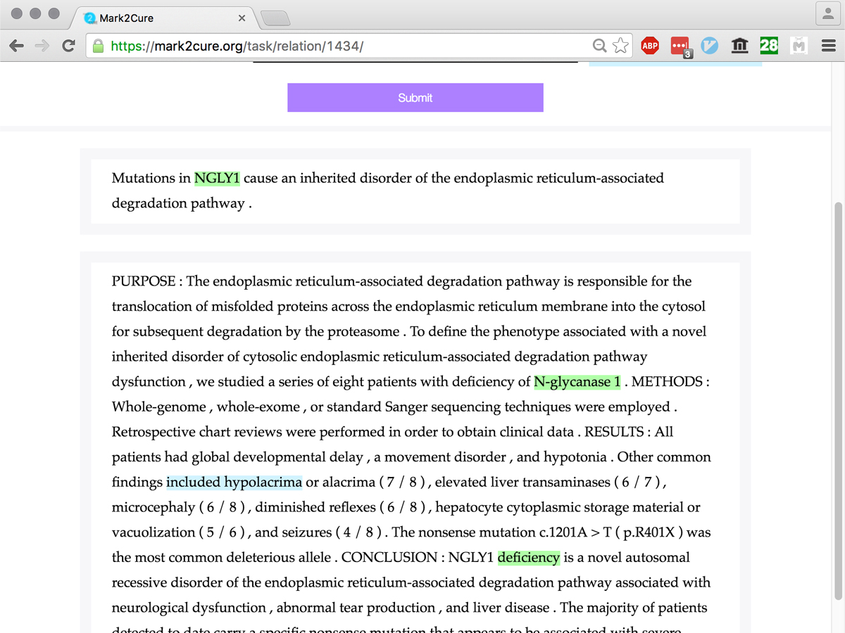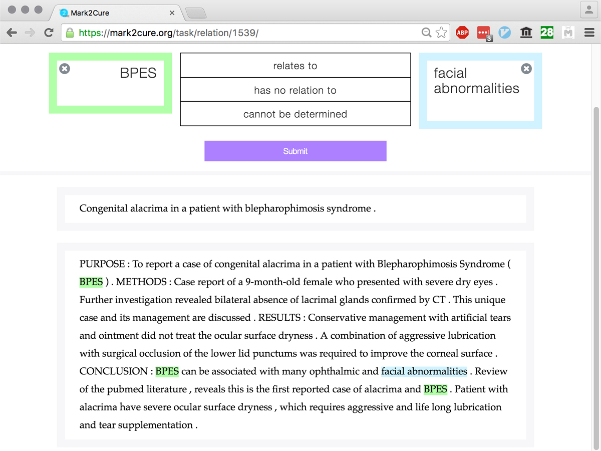 Mark2Cure is a web-based, concept recognition, relationship extraction and validation tool for annotating text. It works by teaching citizen scientists to precisely identify concepts and concept relationships in biomedical text. It allows anyone that can read English, regardless of background, to help in the process of biomedical discovery. Mark2Cure consists of 2 types of tasks: Named Entity Recognition (NER) and Relationship Extraction (RE) Mark2Cure is a project by the Scripps Research Institue.