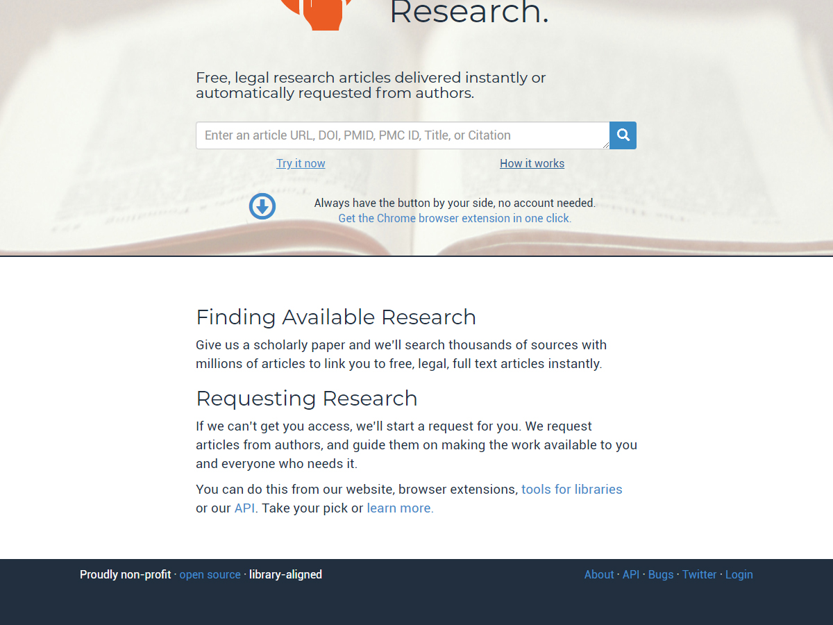 The Open Access Button shows you if there are free and legally available copies of articles as you find them – without you having to search them out. The service uses existing repositories and aggregators to locate accessible full-text from your browser and shows the availability, with a link, using a discrete icon on your screen. The Open Access Button also helps you locate open access Data associated with the work you are seeking. This service will not help you browse or search but will tell you if an accessible copy is available once you have found what you are looking for. They also provide a button that you can install on your browser for instant use.