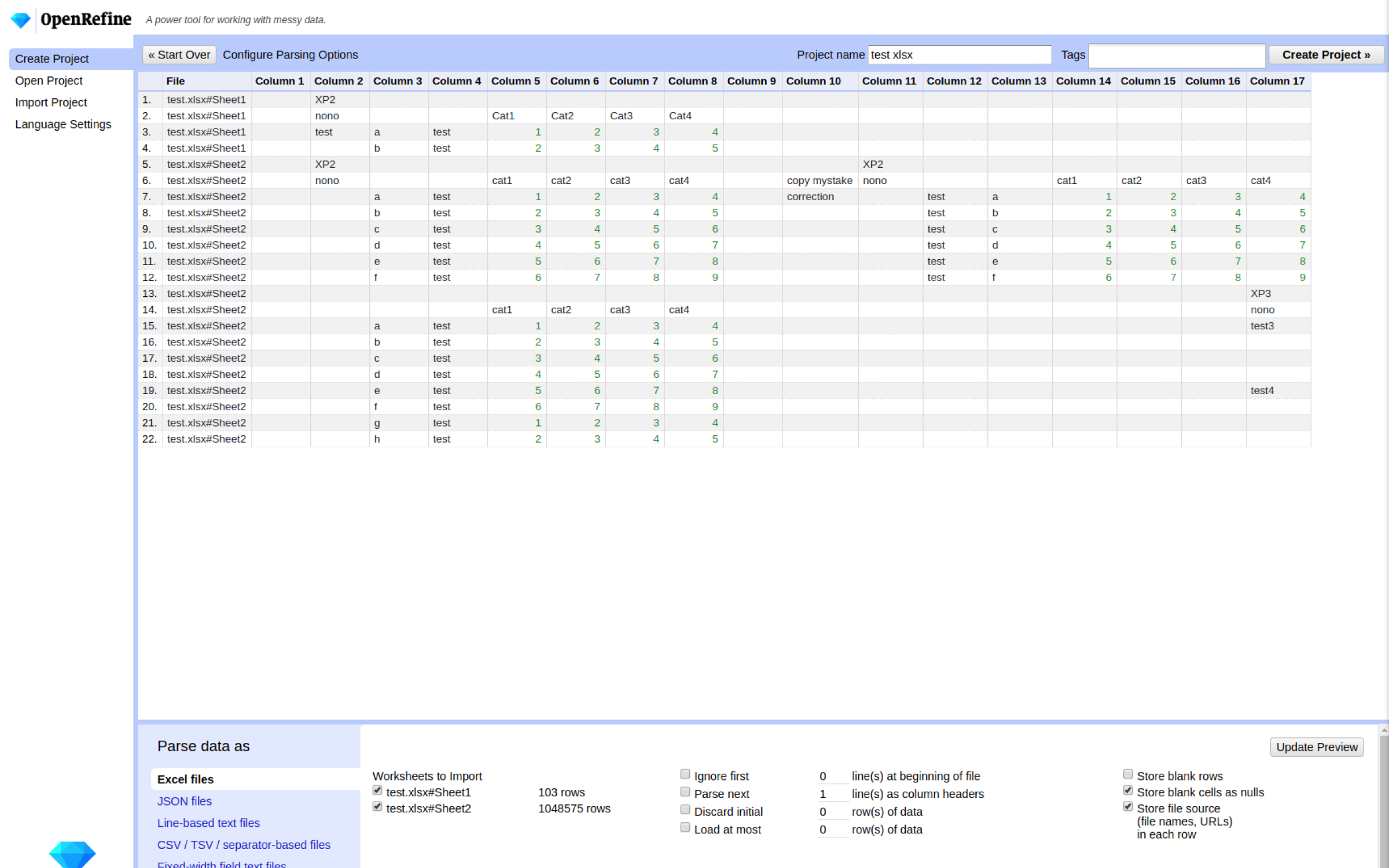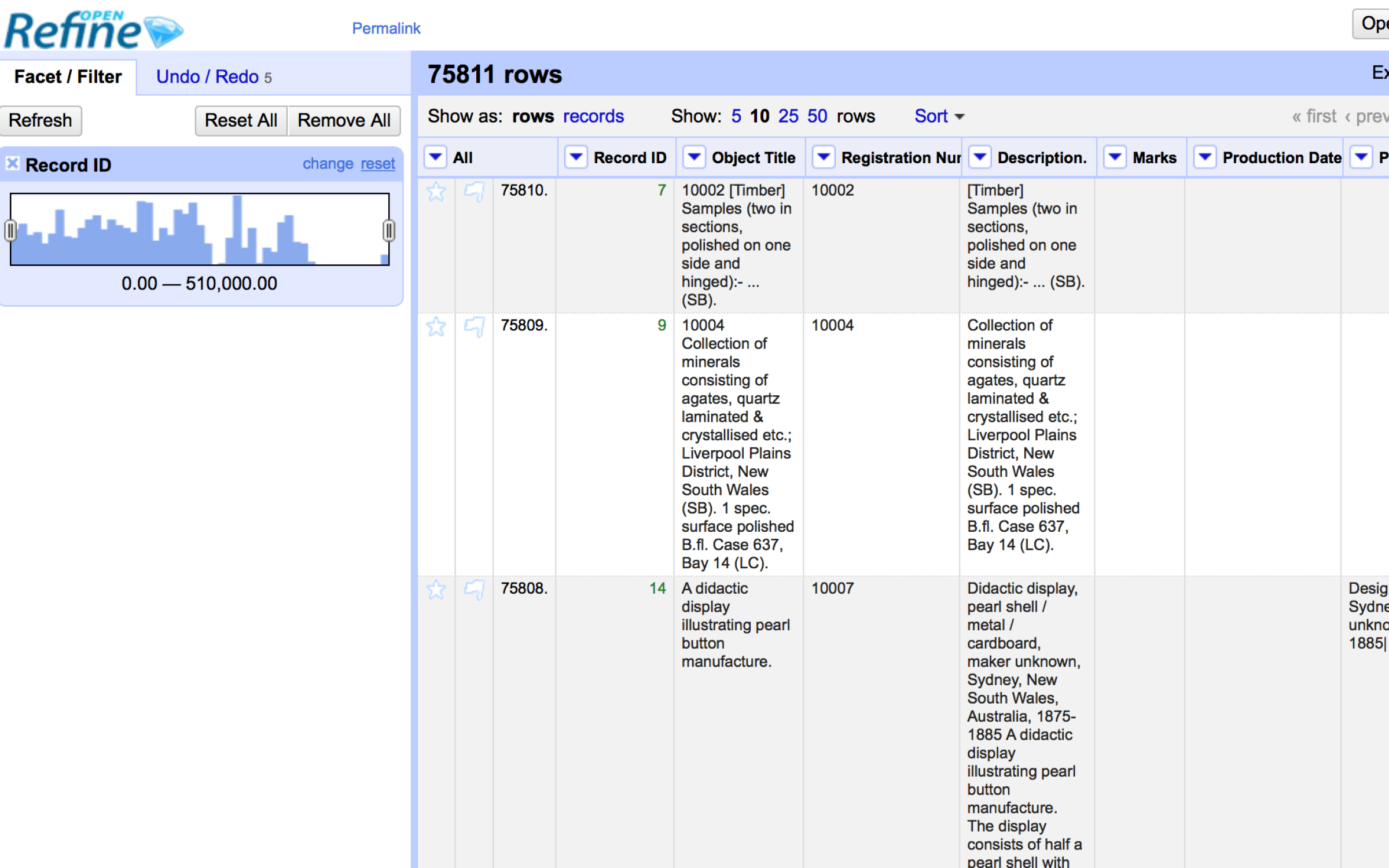 It operates on rows of data which have cells under columns, which is very similar to relational database tables. An OpenRefine project consists of one table. The user can filter the rows to display using facets that define filtering criteria. Unlike spreadsheets, most operations in OpenRefine are done on all visible rows: transformation of all cells in all rows under one column, creation of a new column based on existing column data, etc. All actions that were done on a dataset are stored in a project and can be replayed on another dataset.
