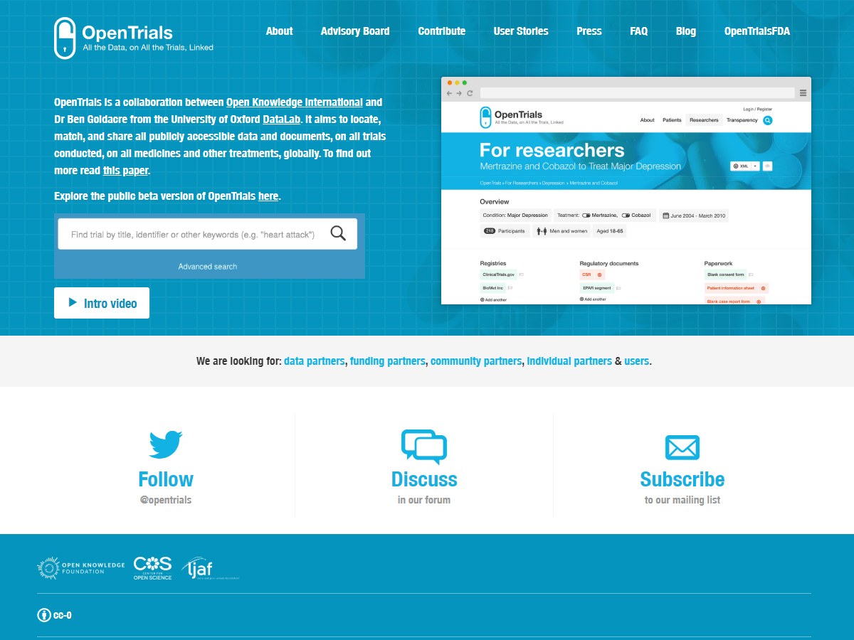 OpenTrials is a collaboration between Ben Goldacre and the tech team at Open Knowledge International. The documents and data relating to a clinical trial can be spread across the internet, in journal articles, registries, regulator archives, and more. This makes it hard to spot what’s missing, and hard to spot discrepancies. OpenTrials aims to thread together all the publicly accessible documents and data, on all clinical trials, in an open database populated through record linkage, ID matching, and crowdsourcing.