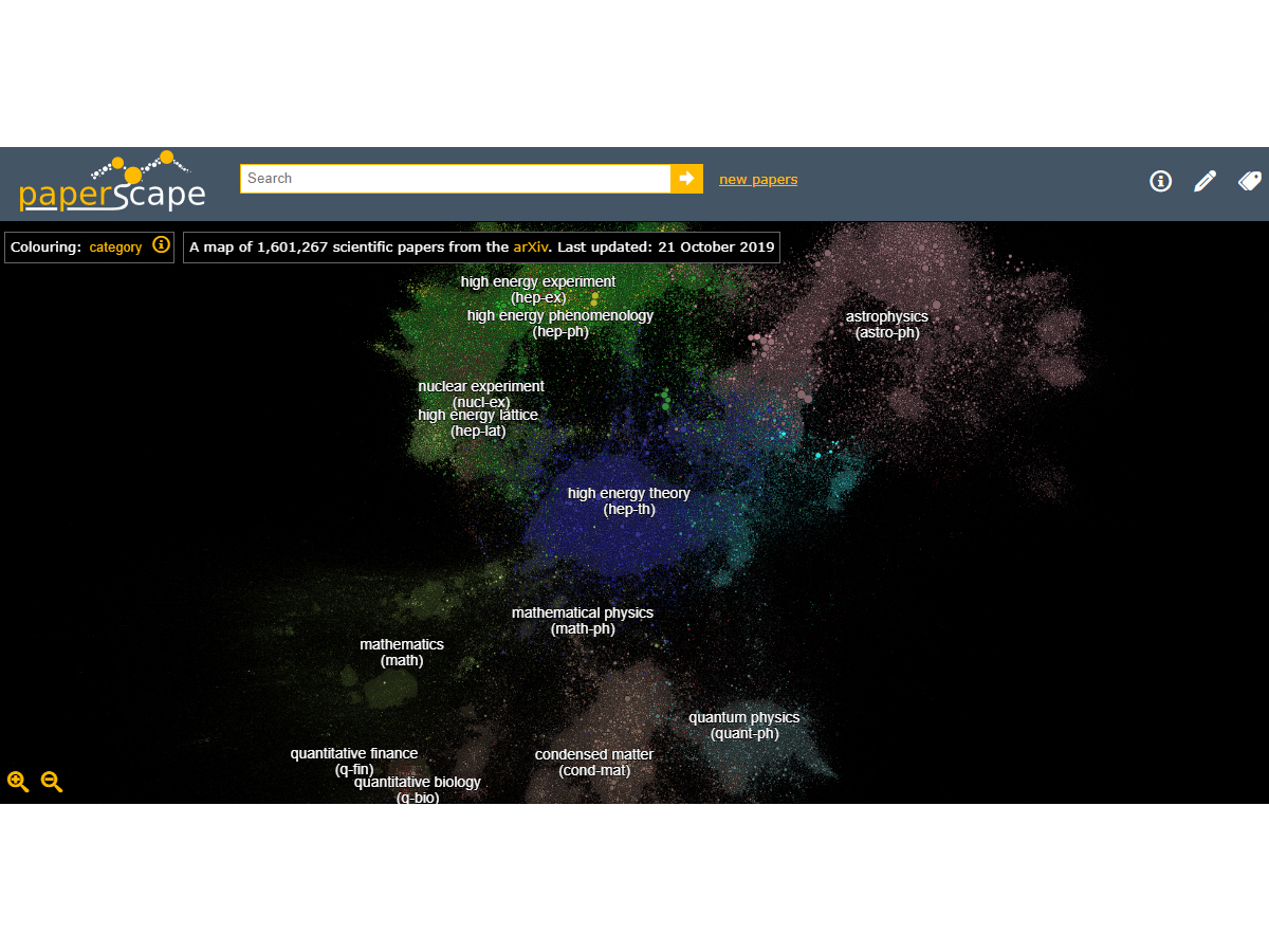 The Paperscape is an infographic designed by two physicists maps the hundreds of thousands of studies in arXiv, an open repository for physics, mathematics, computer science, quantitative biology, finance, and statistics papers that is maintained by Cornell University. It can be explored by panning and zooming. The papers are sized according to their number of citations and positioned according to their references/citations. Different categories of the arXiv are assigned different colours, and newer papers are more brightly coloured.