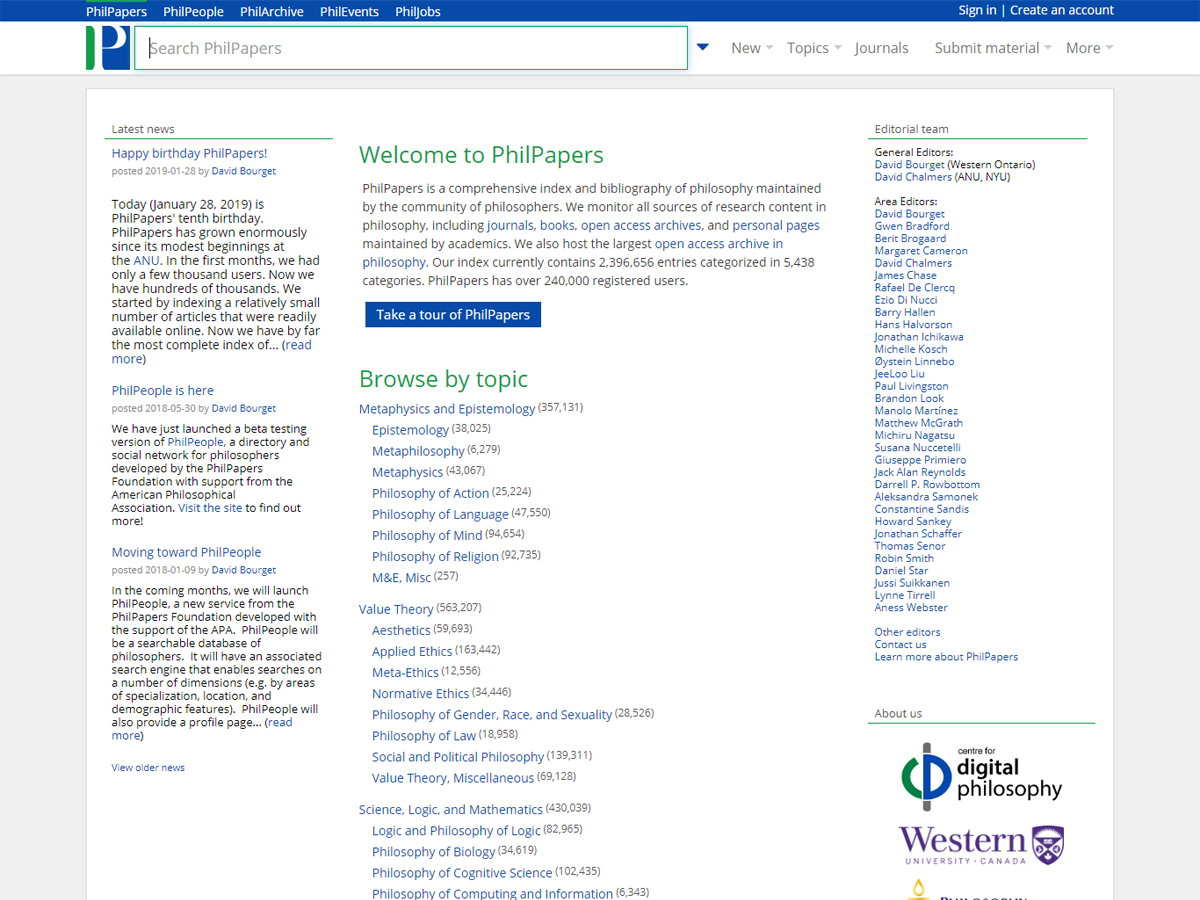 PhilPapers aims to be a comprehensive index and bibliography of philosophy. It's maintained by a community of philosophers and contains research content from journals, books, open access archives, and personal pages maintained by academics. PhilPapers also hosts and integrates the largest open access archive in philosophy, PhilArchives, which is also accessible as a separate site.