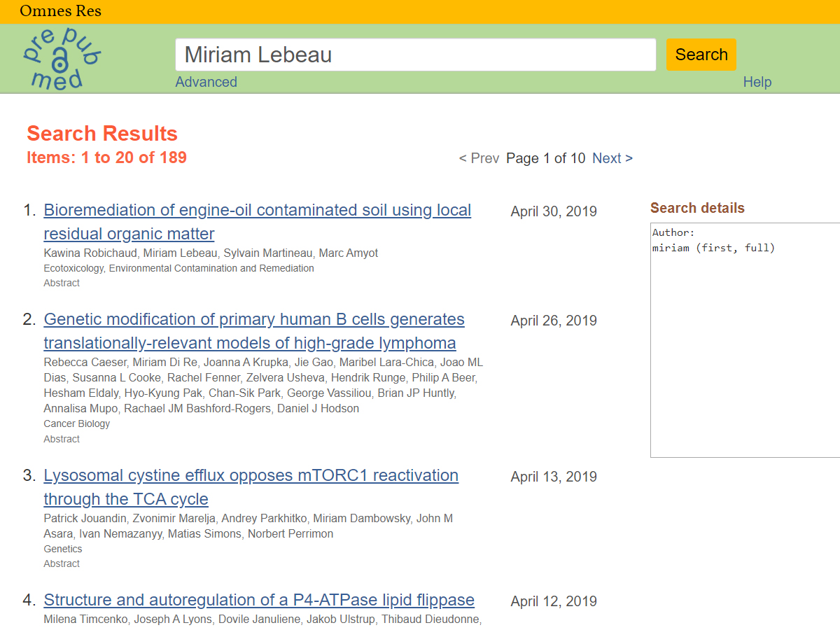 PrePubMed is a platform that indeTypingxes published preprints. PrePubMed indexes tens of thousands of articles from the preprint servers arXiv q-bio, PeerJ Preprints, bioRxiv, preprints.org, and Nature Precedings, as well as articles from F1000Research and Wellcome Open Research. PrePubMed search results provide the preprint title, author, publish date, and author affiliations, along with a link to the preprint. Search results are organized by date with the most recent articles appearing at the top of the list.
