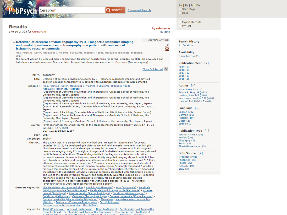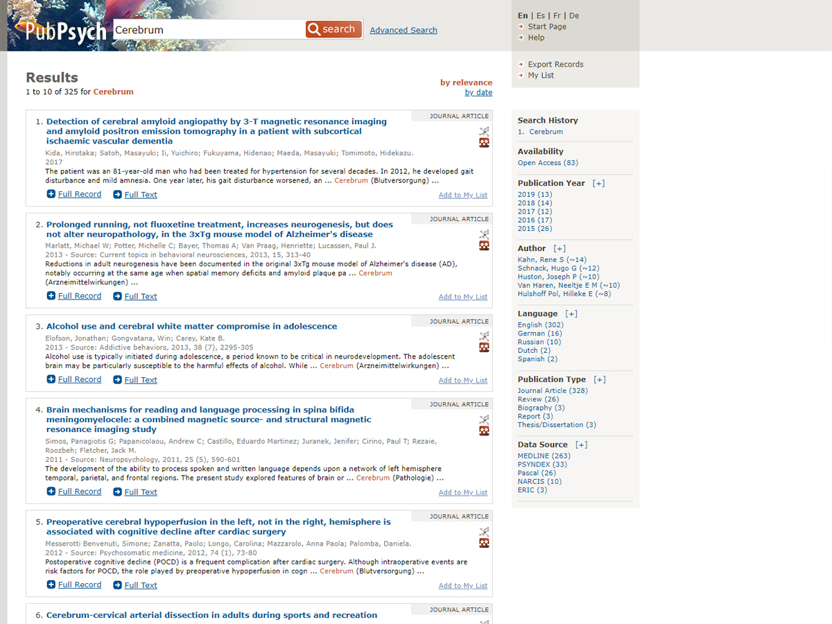 Coordinated by the research support organization, Leibniz Institute for Psychology Information (ZPID), PubPsych offers a comprehensive and balanced selection of resources from a growing number of international databases with a European focus, covering the needs of academic and professional psychologists. The search interface is available in English, Spanish, French, and German.