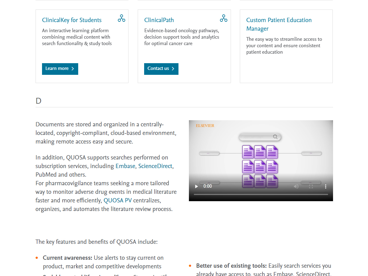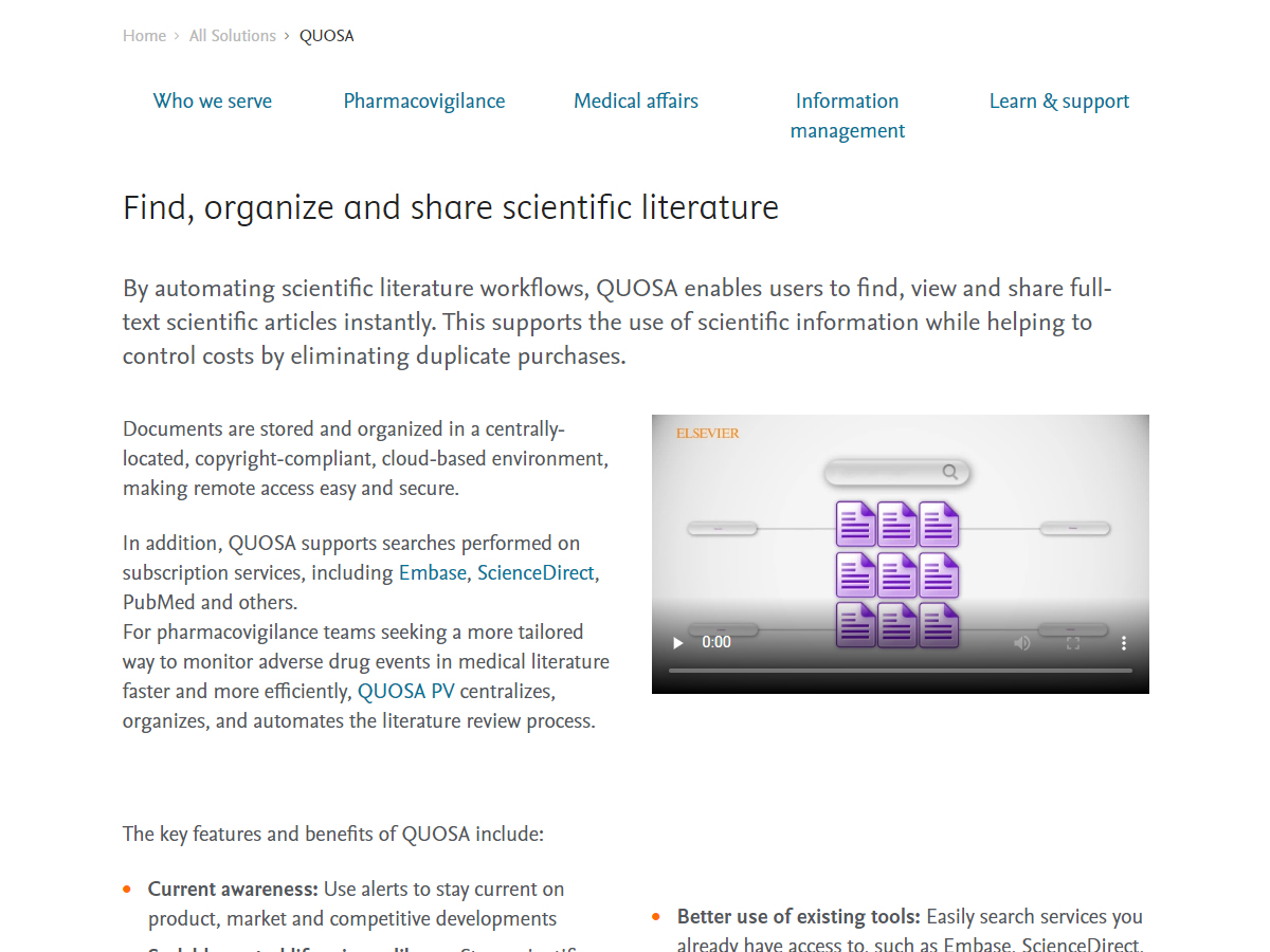 Documents are stored and organized in a centrally-located, copyright-compliant, cloud-based environment, making remote access easy and secure. In addition, QUOSA supports searches performed on subscription services, including Embase, ScienceDirect, PubMed, and others. For pharmacovigilance teams seeking a more tailored way to monitor adverse drug events in medical literature faster and more efficiently, QUOSA PV centralizes, organizes, and automates the literature review process.