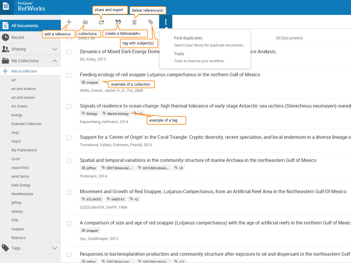 RefWorks is an online citation manager. It is produced by Ex Libris, a ProQuest company. RefWorks LLC was founded in 2001 and the software was marketed by Cambridge Scientific Abstracts from 2002 until being acquired by ProQuest in 2008. The usefulness of RefWorks is enhanced by the numerous databases and catalogs that allow you to export citations of articles, books, and other resources into RefWorks for storing and managing. You can read annotate, organize, and cite your research as well as collaborate with friends and colleagues by sharing collections. RefWorks is able to generate bibliographies of citations in a variety of formats (e.g., APA, Turabian, MLA). There are two varieties are available: RefWorks Legacy and the new ProQuest RefWorks (Flow)
