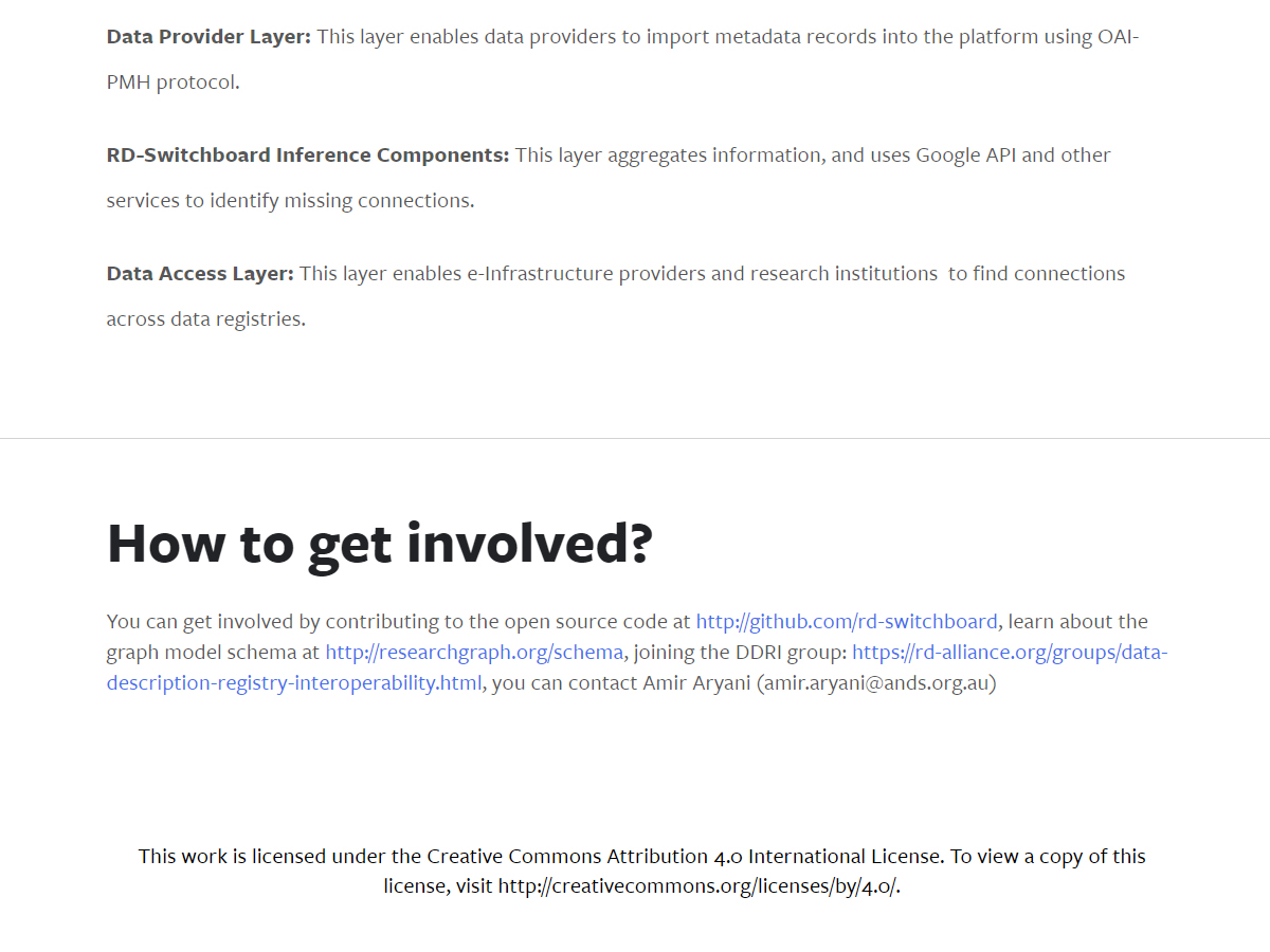 It is an open, collaborative project administered by Research Data Alliance's (RD-A) DDRI WorkGroup. The way RD-Switchboard operates is analogous to the discovery functions featured on online bookstores such as Amazon. These sites link items, based on similar publishers, authors, and related topics. In the case of RD-Switchboard, items are linked through co-authorship, joint funding, and research grants. The system aggregates these links from national and international registries, utilizing graph modeling technology to identify the missing links between data sets.