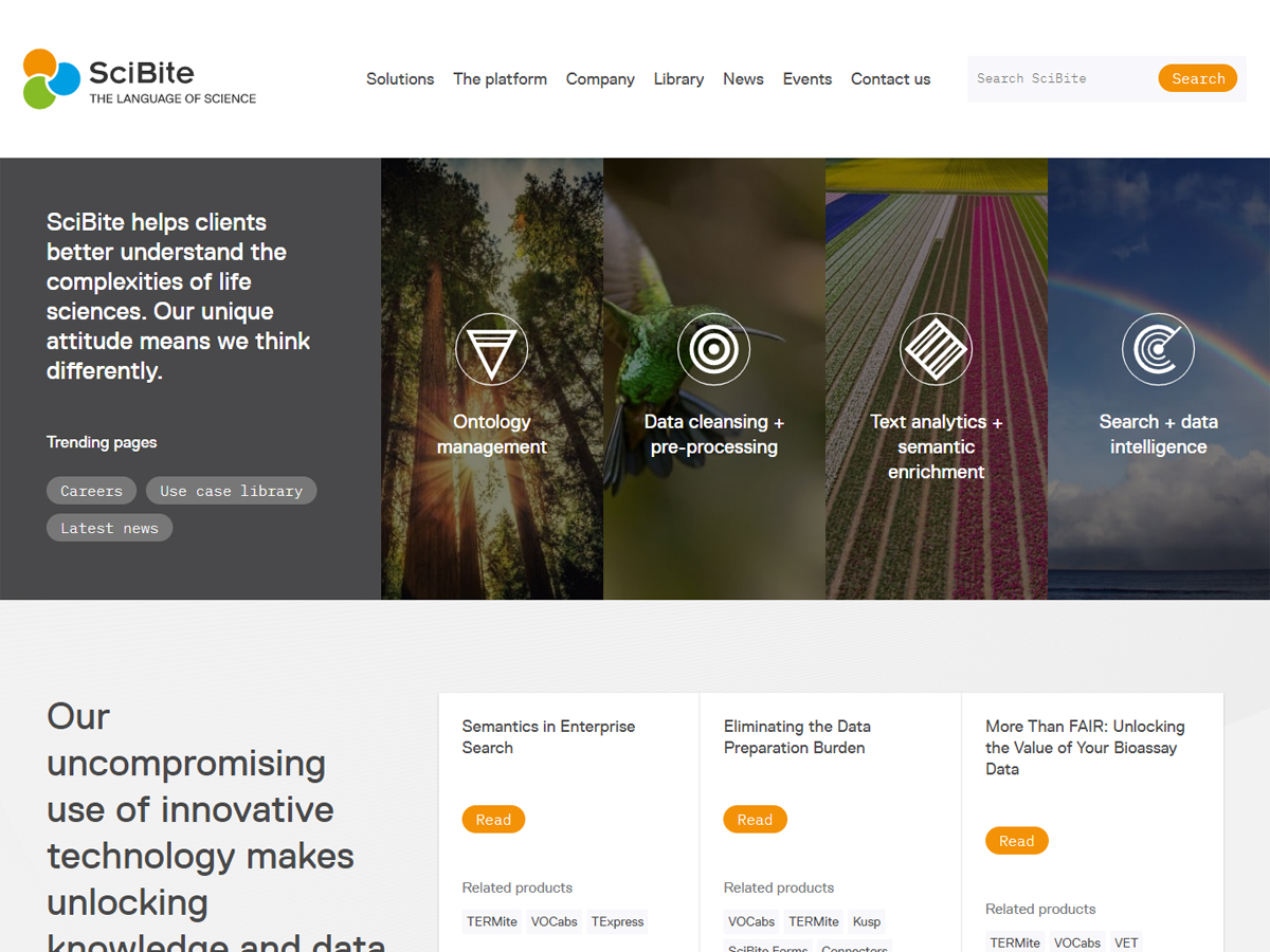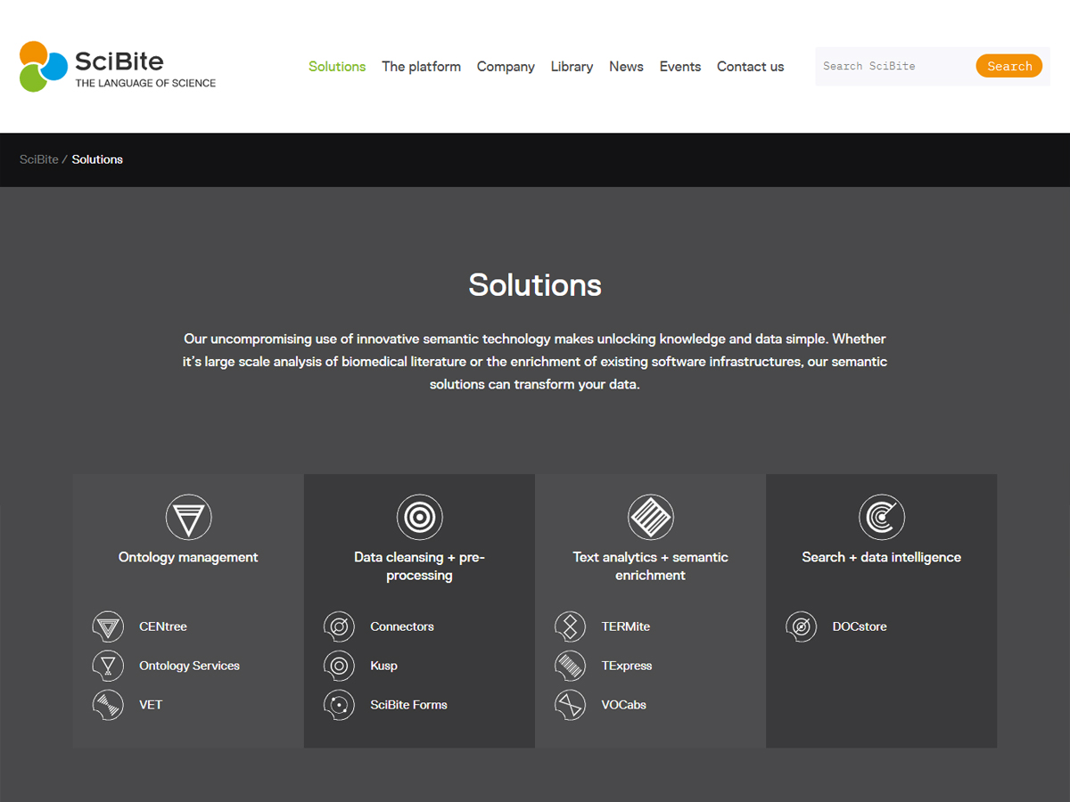SciBite offers a complete semantic services platform that can be used as a data analytics solution by end-users and also as a "pluggable" component to transform existing IT infrastructures into more scientifically aware systems. SciBite's technology rapidly scans scientific text and identifies the key concepts stated, such as drugs, proteins, companies, targets, outcomes, and measures. In doing so, unstructured text is transformed into ontology-based indexed data.