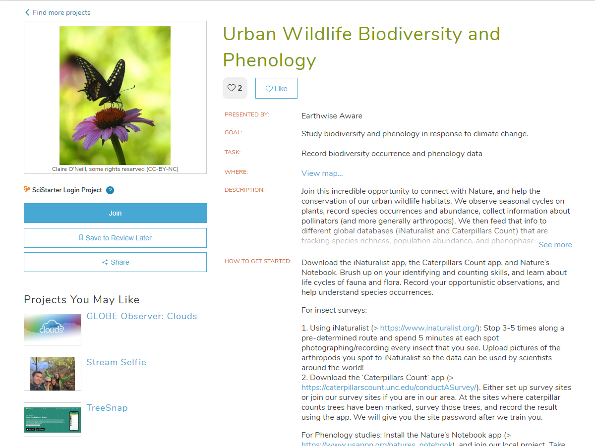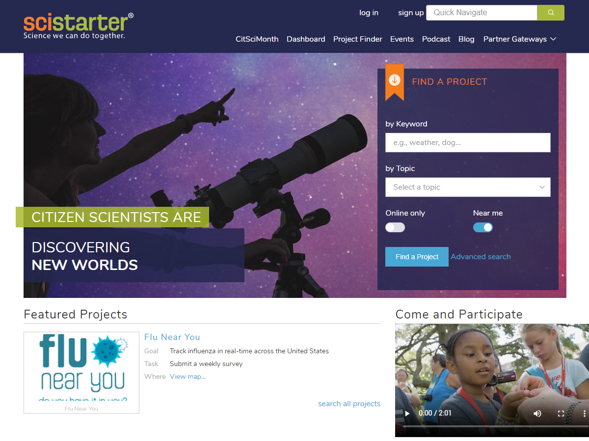 SciStarter is the place to find, join, and contribute to science through providing people access to more than 3,000 searchable formal and informal research projects and events. But more than just a project directory, SciStarter also offers a coordinated place to record contributions and access the tools and instruments needed to participate in citizen science projects. SciStarter also supports researchers in managing projects, including best practices for engaging participant partners.