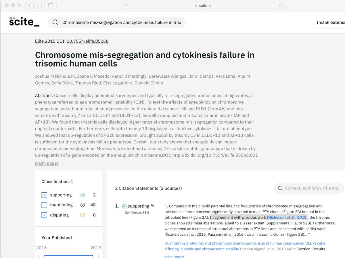 scite is a platform for discovering and evaluating scientific articles via Smart Citations. Smart Citations allow users to see how a scientific paper has been cited by providing the context of the citation and a classification describing whether it provides supporting or disputing evidence for the cited claim.