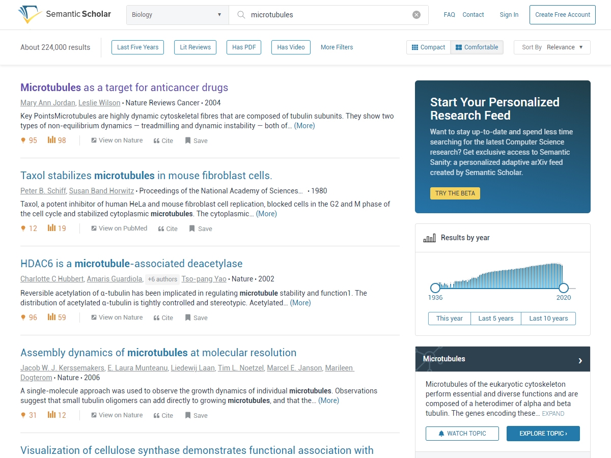 Semantic Scholar is a project developed at the Allen Institute for Artificial Intelligence. Publicly released in November 2015, it is designed to be an AI-backed search engine for scientific journal articles. The project uses a combination of machine learning, natural language processing, and machine vision to add a layer of semantic analysis to the traditional methods of citation analysis, and to extract relevant figures, entities, and venues from papers. As of January 2018, following a project that added biomedical papers and topic summaries, the Semantic Scholar corpus included more than 40 million papers from computer science and biomedicine. As of August 2019, the number had grown to more than 173 million after the addition of the Microsoft Academic Graph records.
