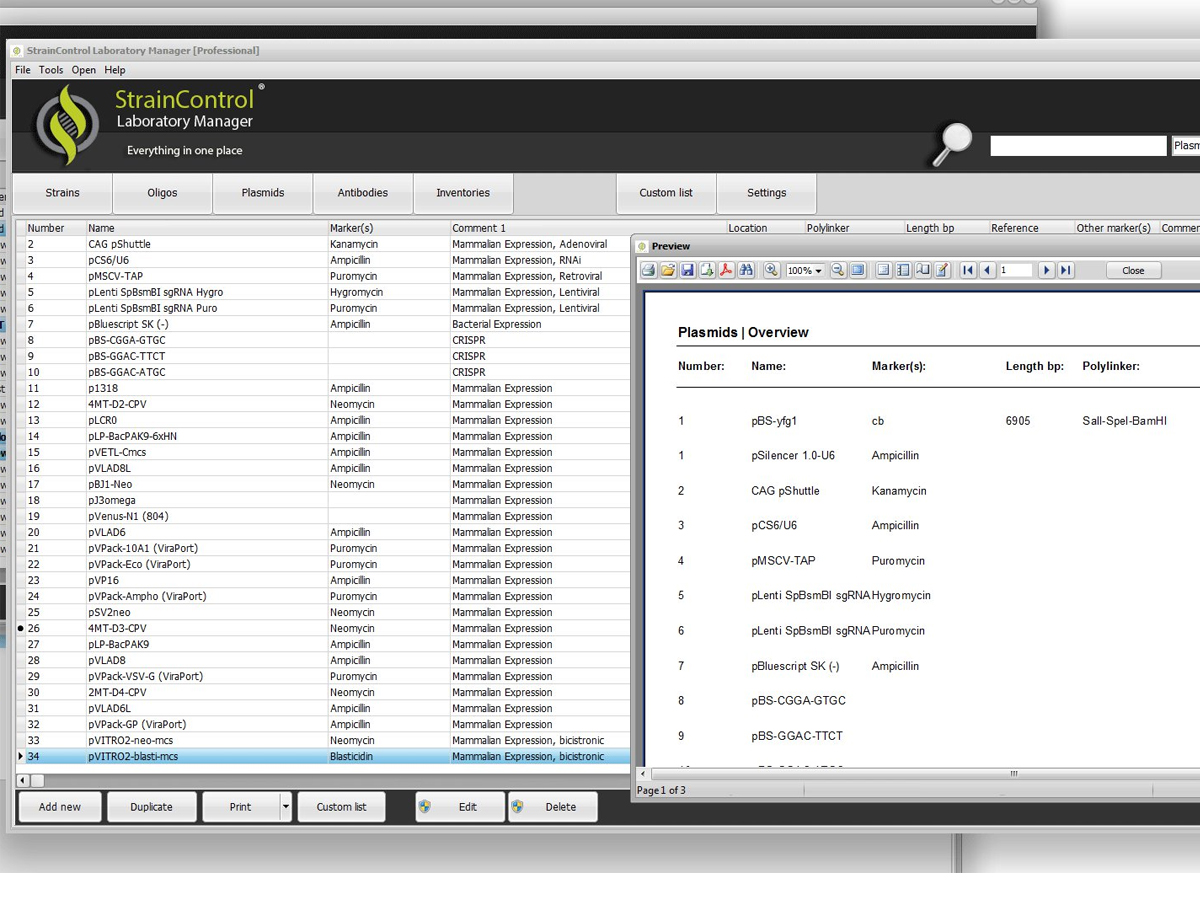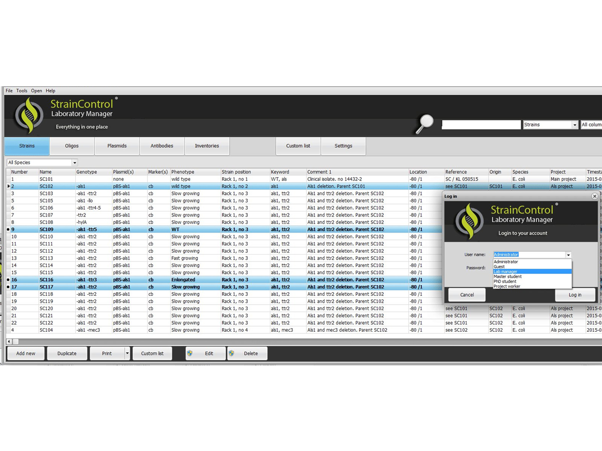 StrainControl Laboratory Manager is a windows-software for researcher to help organizing the lab. Keep track of strains, cell-lines, plasmids, oligos, antibodies, inventories, chemicals and more. StrainControl aims to help the user to manage everything in the laboratory. It permits to create database, share it on a network, create user accounts and manage associated rights, make links between files like protocols or images and the database. The user can customize all field titles to fit the laboratory needs.