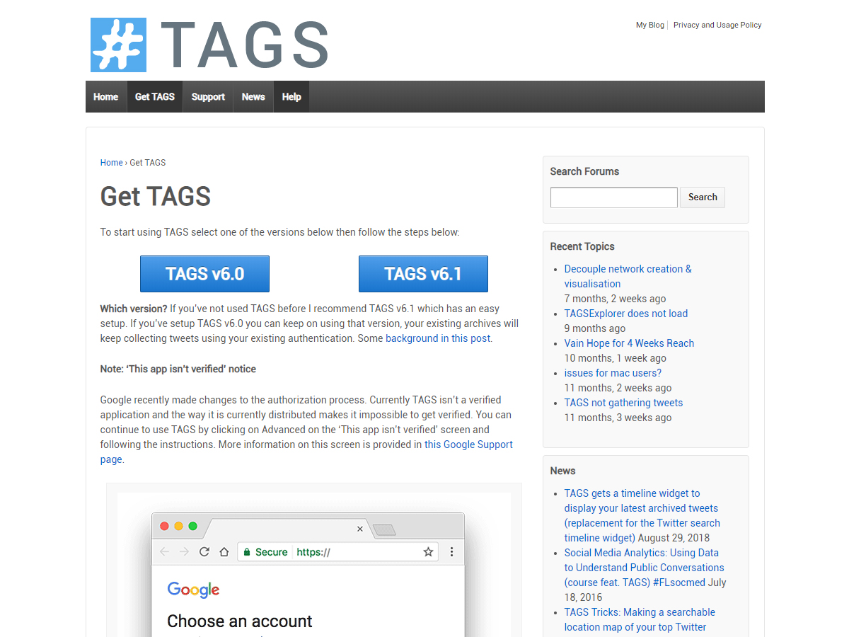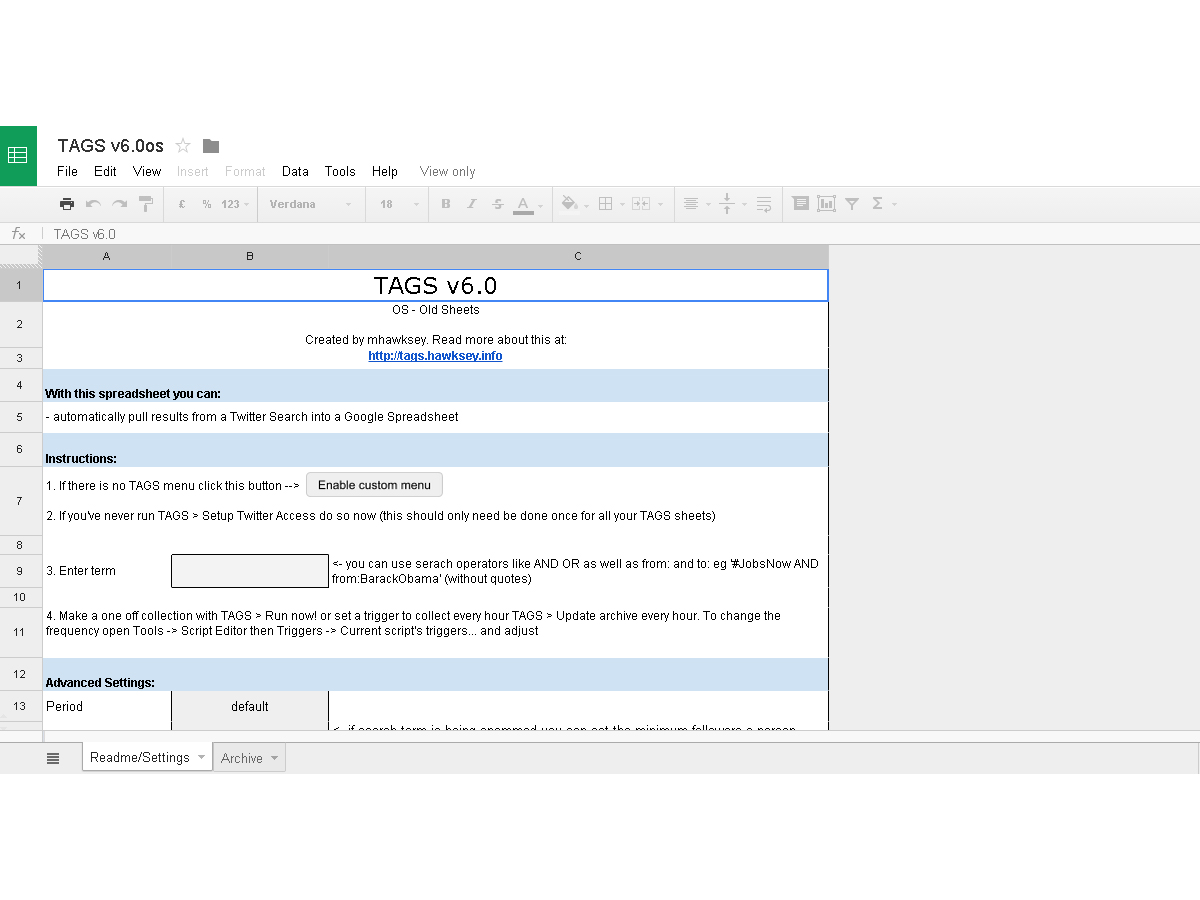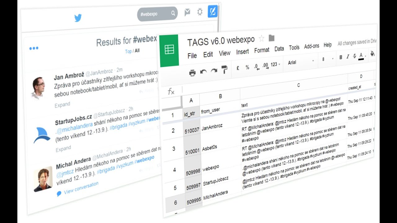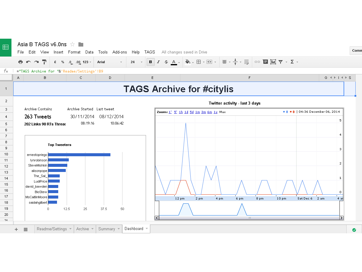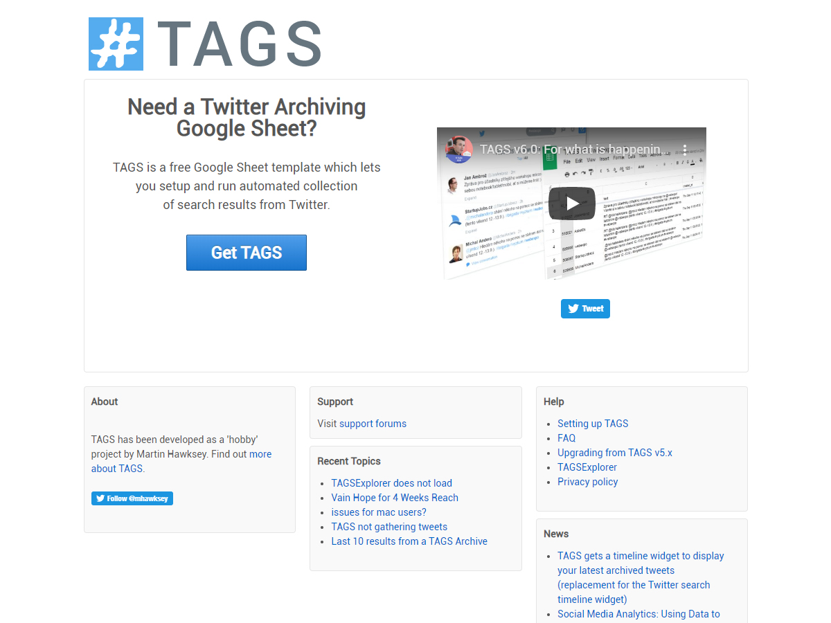 TAGs (Twitter Archiving Google Sheet) is created by Martin Hawksey to automatically save copies of tweets to a Google Spreadsheet for a specific hashtag or search item. This is to help support the collection, analysis, and exploration of Twitter hashtag communities. By collecting this data, the spreadsheet offers a number of ways to view a summary of the activity, including a visualized “Conversation Explorer.