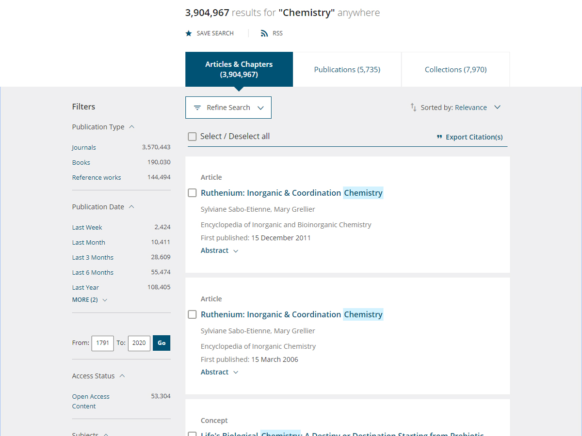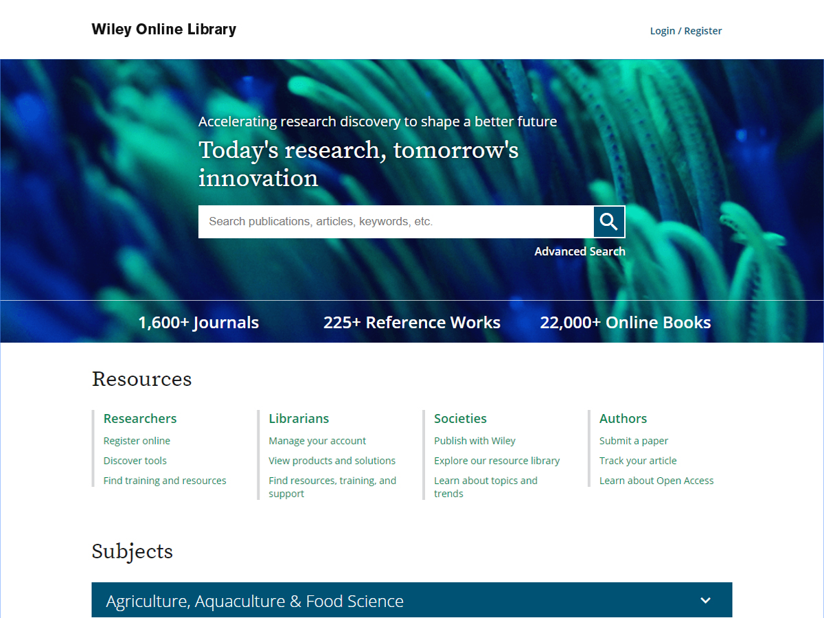 Wiley Online Library provides most extensive multidisciplinary collections of online resources, covering chemistry; computer science; earth and environmental science; education; engineering; law; life sciences; mathematics and statistics; medicine and healthcare; physics and astronomy; polymers and materials science; psychology; and social sciences. The database includes full-text journal articles and some full-text reference sources. It includes abstracts of additional journal articles and reference sources, summary information for online books, citations to Current Protocols laboratory manuals, and abstracts of databases.