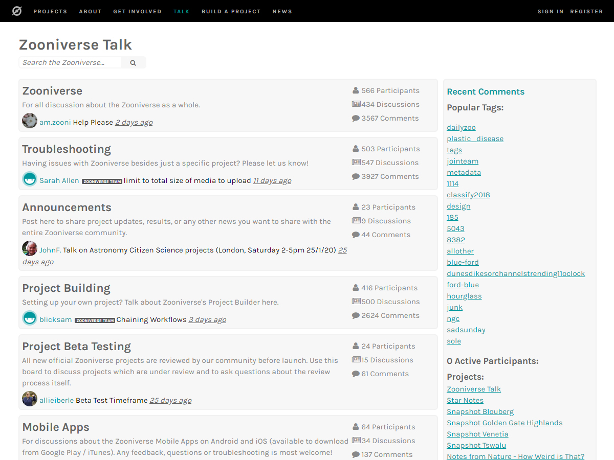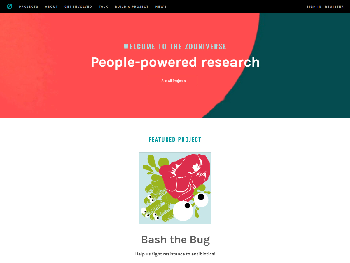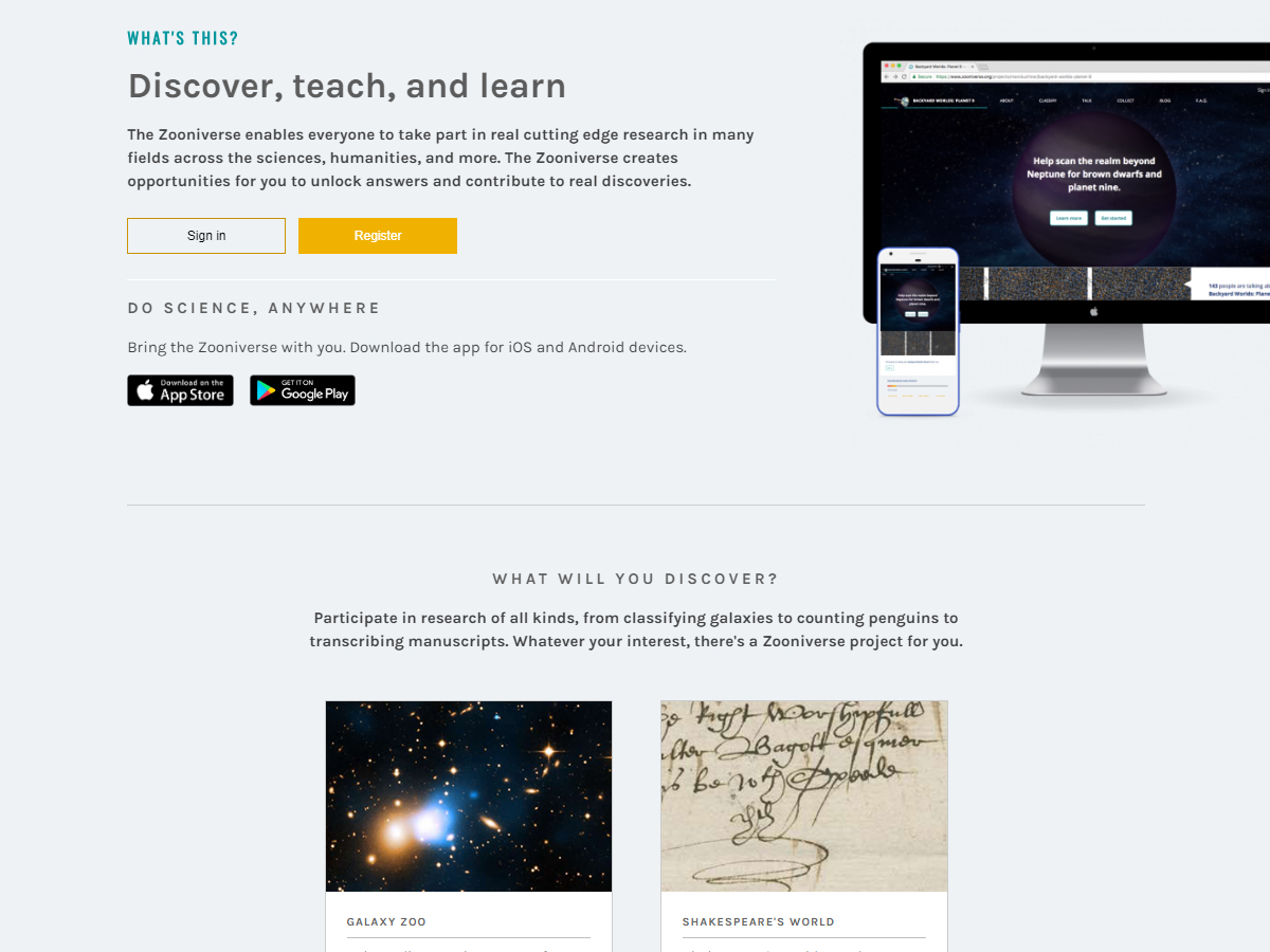 The Zooniverse provides opportunities for people around the world to contribute to real discoveries in fields ranging from astronomy to zoology. Welcome to the largest online platform for collaborative volunteer research. This research is made possible by volunteers—hundreds of thousands of people around the world who come together to assist professional researchers. The Zooniverse has engaged 1.5 million registered users in online citizen science with hundreds of professional researchers around the world.
