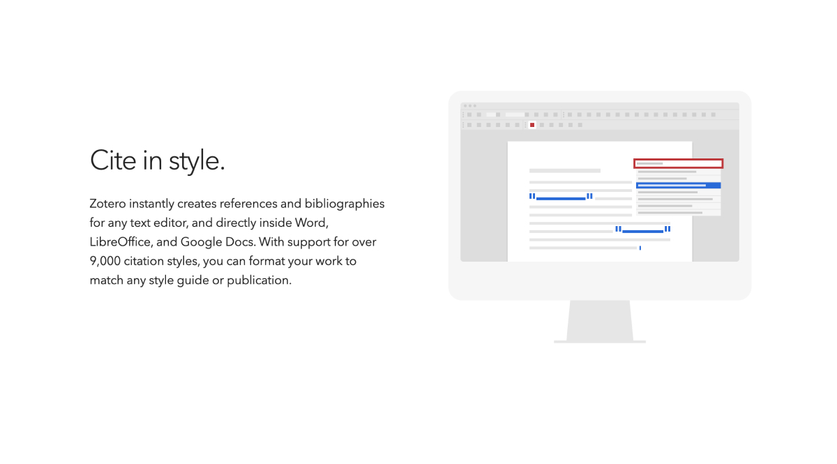 A open-source reference management software to manage bibliographic data and related research materials (such as PDF files). Notable features include web browser integration, online syncing, generation of in-text citations, footnotes, and bibliographies, as well as integration with the word processors Microsoft Word, LibreOffice Writer, and Google Docs. It is produced by the Center for History and New Media at George Mason University.